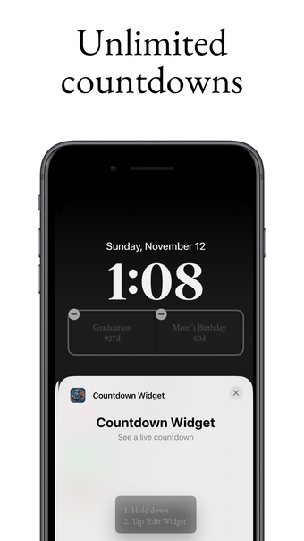 Countdown Widget, iPhone kullanıcıları için tasarlanmış bir geri sayım uygulamasıdır. Bu ücretsiz uygulama, kullanıcıların ana ve kilit ekranlarında sınırsız sayıda geri sayım widget'ı oluşturmalarına olanak tanır. Kullanıcılar, belirli tarih ve saatlere geri sayım yaparak önemli etkinliklerini takip edebilirler.
